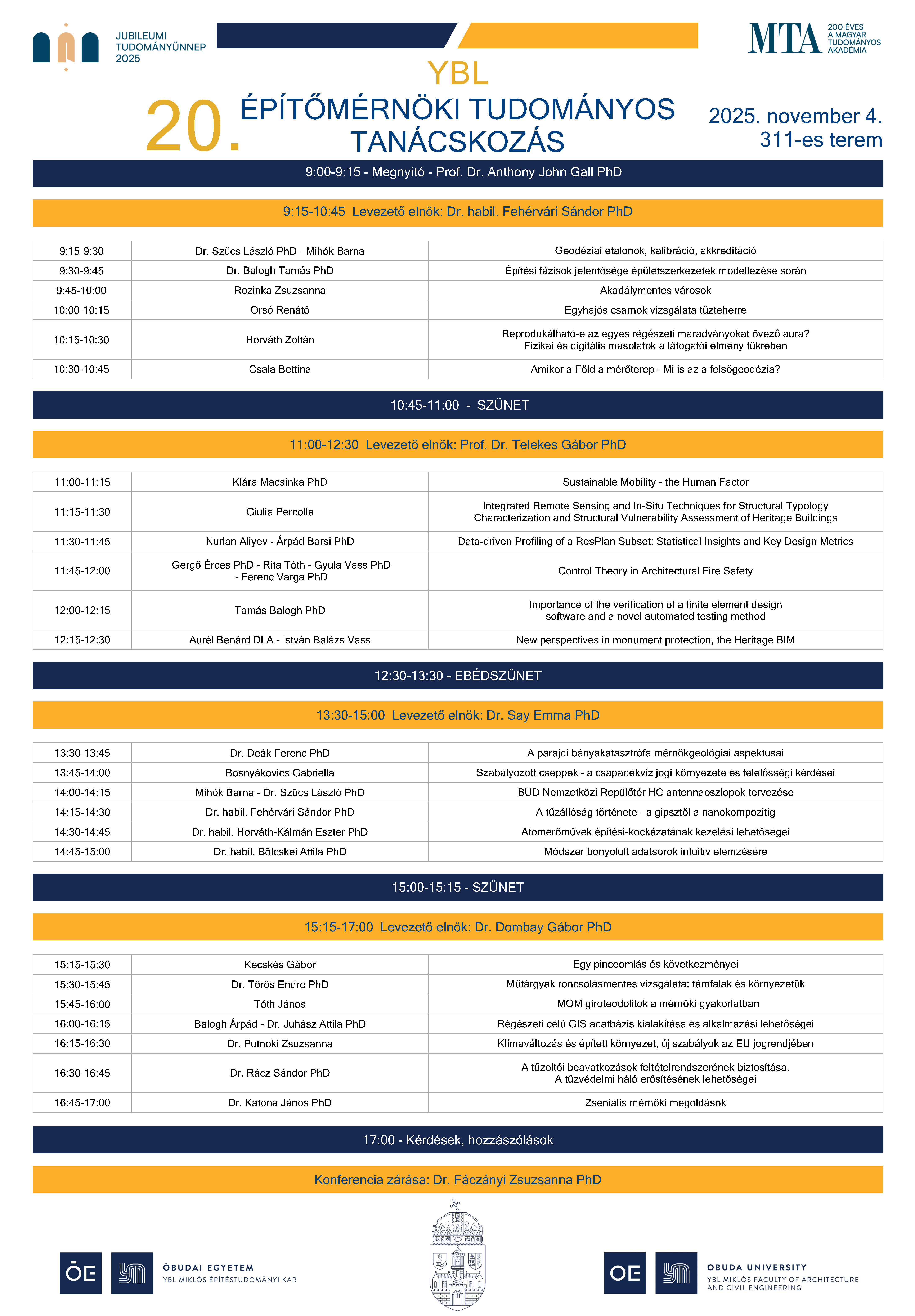 Az alábbiakban megtekinthető a 20. Építőmérnöki Tudományos Tanácskozás programja, melyre 2025. november 4-én kerül sor az Óbudai Egyetem Ybl Miklós Építéstudományi Karán (Thököly út 74.A/311.)