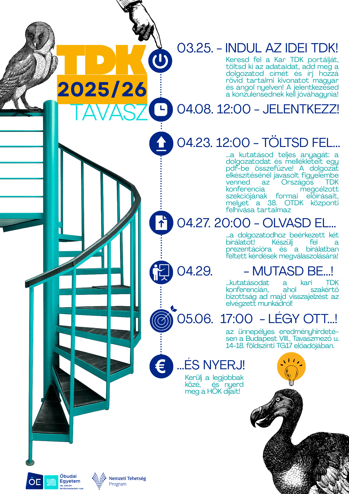 A TDK, a tudományos diákköri mozgalom 70 éve működik Magyarországon. Lényege a tanár és a diák alkotó együttműködése, amely a tehetséggondozás sajátos formája a felsőoktatásban. Az Óbudai Egyetem elkötelezett az önként vállalt hallgatói tudományos tevékenység támogatásában. Próbálják ki magukat ebben az alkotó tevékenységben, melynek eredménye nemes versenyben jelenik meg a TDK konferenciákon.