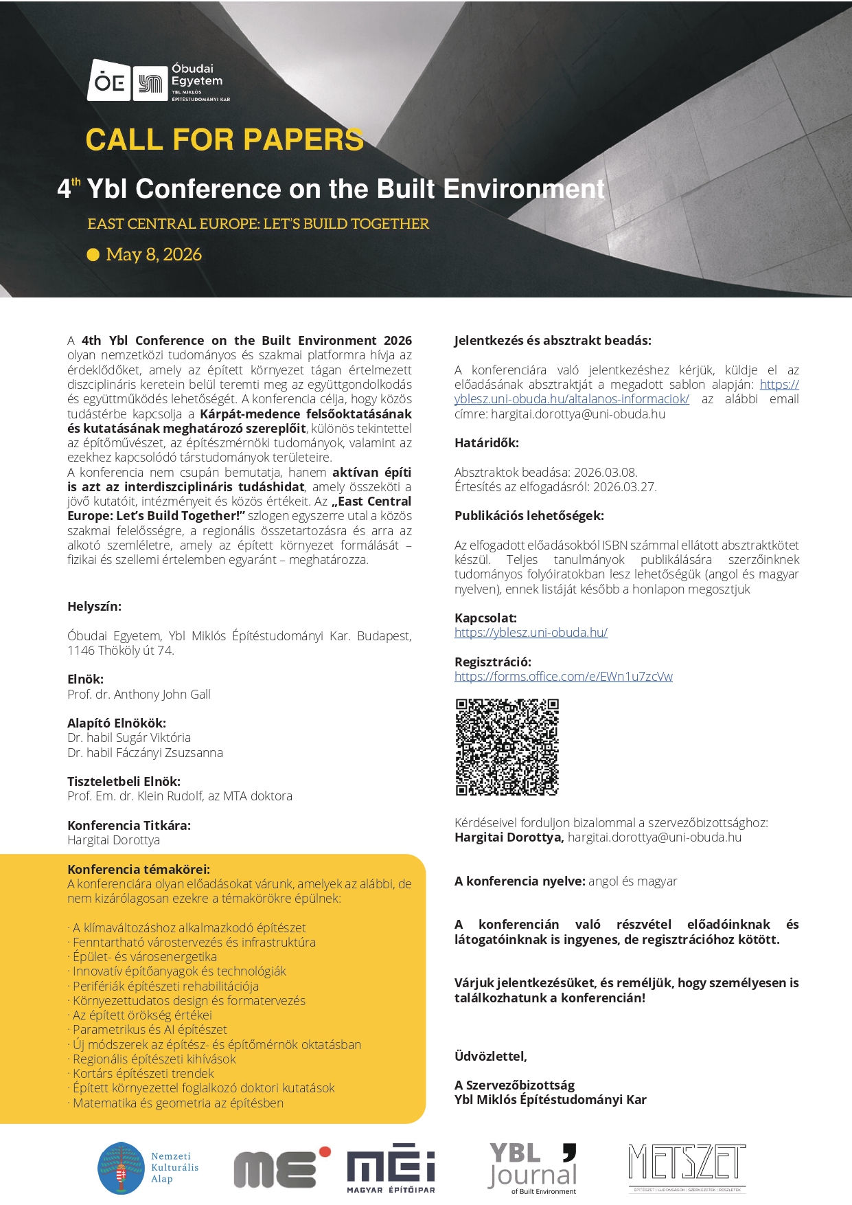 A 4th Ybl Conference on the Built Environment 2026 olyan nemzetközi tudományos és szakmai platformra hívja az érdeklődőket, amely az épített környezet tágan értelmezett diszciplináris keretein belül teremti meg az együttgondolkodás és együttműködés lehetőségét. A konferencia célja, hogy közös tudástérbe kapcsolja a Kárpát-medence felsőoktatásának és kutatásának meghatározó szereplőit, különös tekintettel az építőművészet, az építészmérnöki tudományok, valamint az ezekhez kapcsolódó társtudományok területeire.