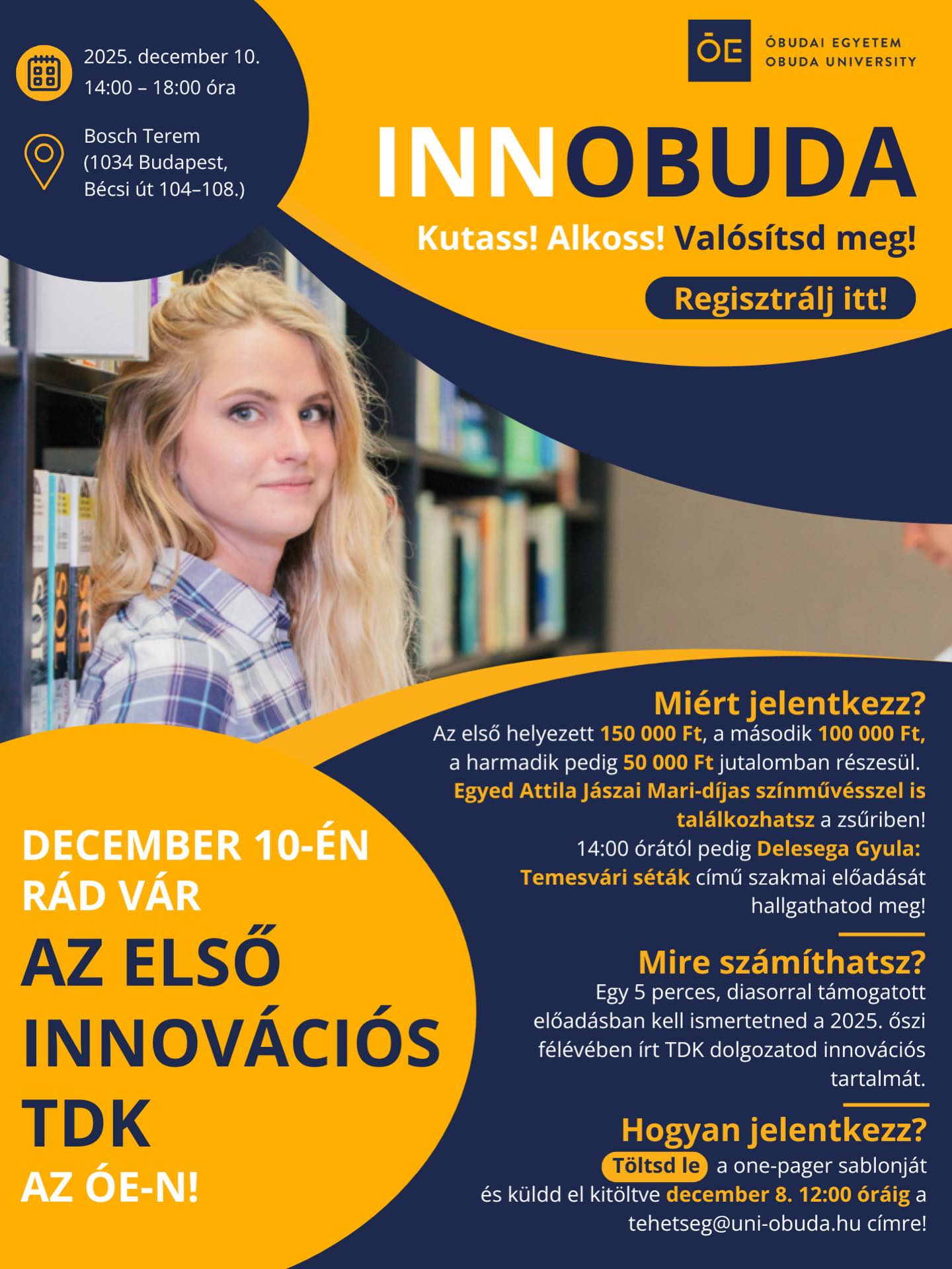 Új tehetséggondozó eseményt szervez az Óbudai Egyetem Tehetséggondozási Irodája. Az I. InnOBUDA célja, hogy fórumot biztosítson a TDK-munka során innovatív, gyakorlatorientált megoldásokat létrehozó hallgatóknak. A rendezvény 2025. december 10-én, 15:00 órától 18:00 óráig kerül megrendezésre a Kandó Kálmán Kollégium Bosch termében.