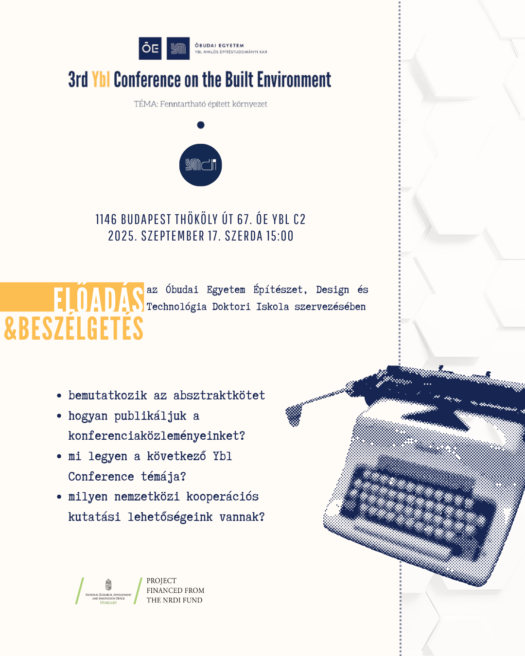 Az Óbudai Egyetem Építészet, Design és Technológia Doktori Iskola nyílt, tudományos ismeretterjesztő előadást szervez a 3rd Ybl Conference on the Built Environment 2025. májusban megrendezett konferencia tapasztalatainak ismertetésére.