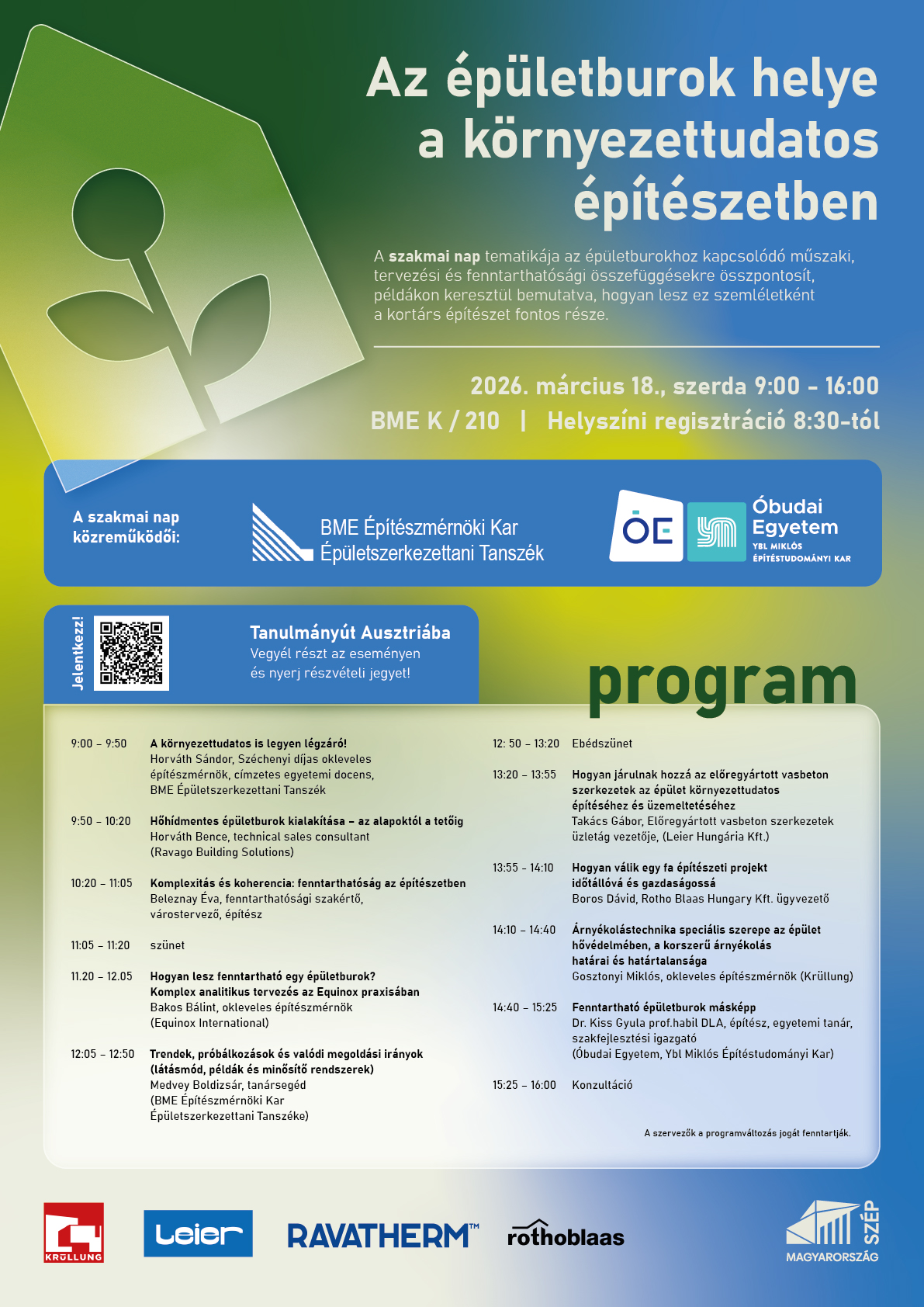 A 2026. március 18-i esemény és a pályázat a BME Építészmérnöki Kar Épületszerkezettani Tanszéke és az Óbudai Egyetem Ybl Miklós Építéstudományi Kara együttműködésével kerül megrendezésre. A szakmai konferencia előadásainak gerincét a pályázat zsűritagjainak prezentációi adják - Horváth Sándor (BME), dr. Kiss Gyula DLA (YBL), Beleznay Éva, fenntarthatósági szakrétő –, valamint előad a 2024. évi pályázat nyertes tervezőcsapatának vezetője, Bakos Bálint (Equinox) is.